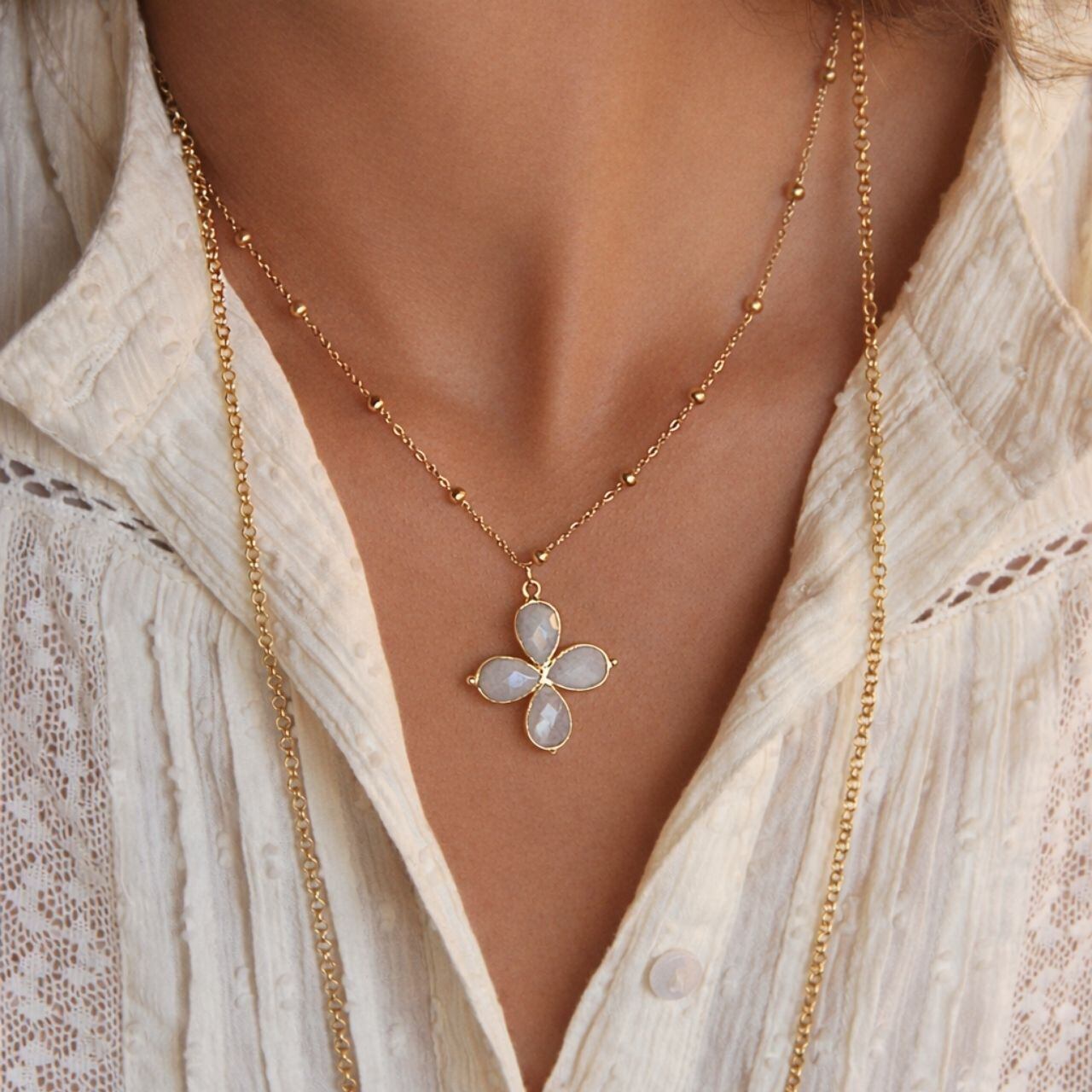 石が放つほのかな輝きが首元に透明感を与え、落ち着いた女性らしさを引き立てます。