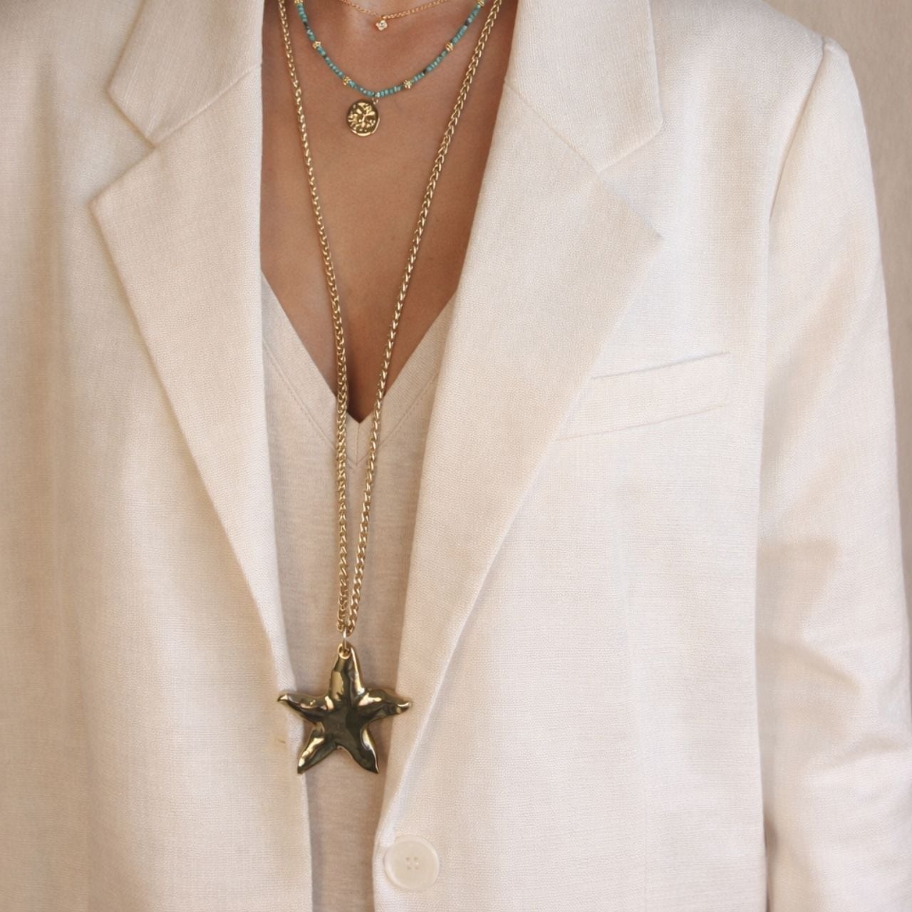 印象的なスターフィッシュモチーフが目を引くロングネックレス。