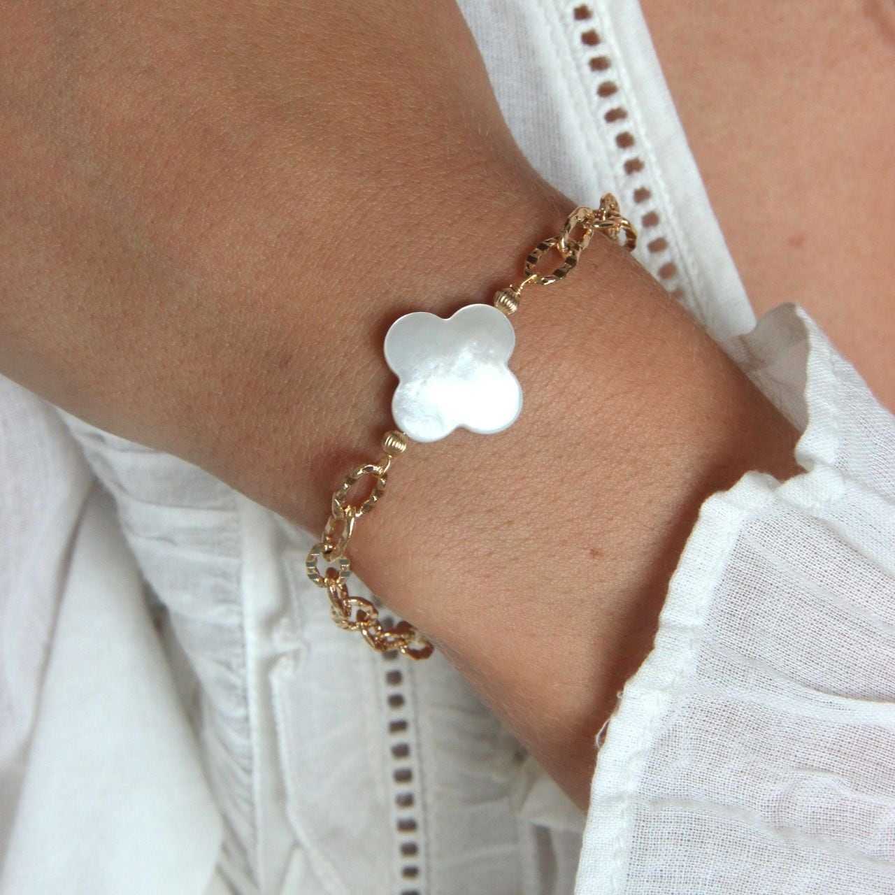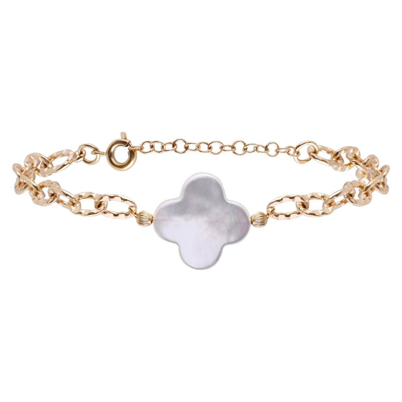 クローバーを思わせるモチーフに、白蝶貝のやわらかな光沢が重なるデザイン。