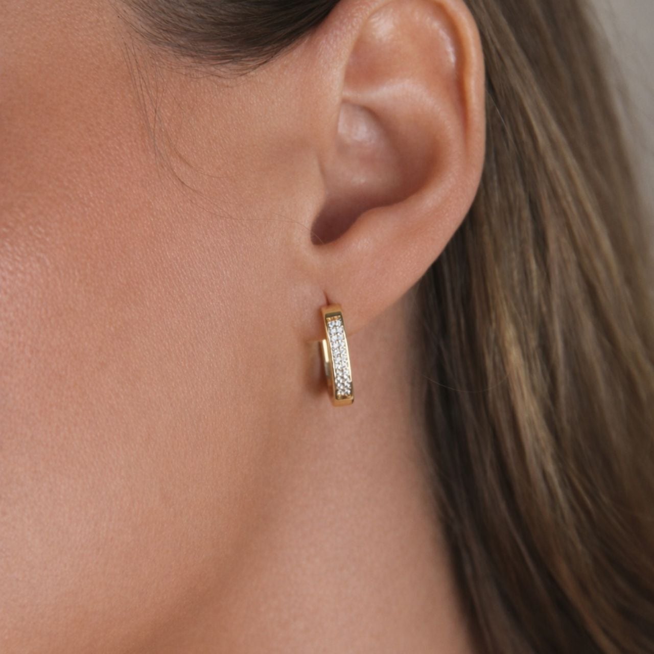 控えめなサイズ感ながら光を受けて繊細にきらめき、顔まわりを明るく見せてくれます。
