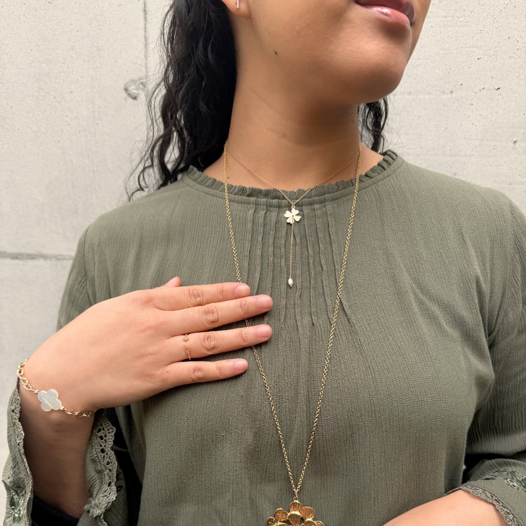 クローバーを思わせるモチーフにストーンの輝きを添えたデザイン。