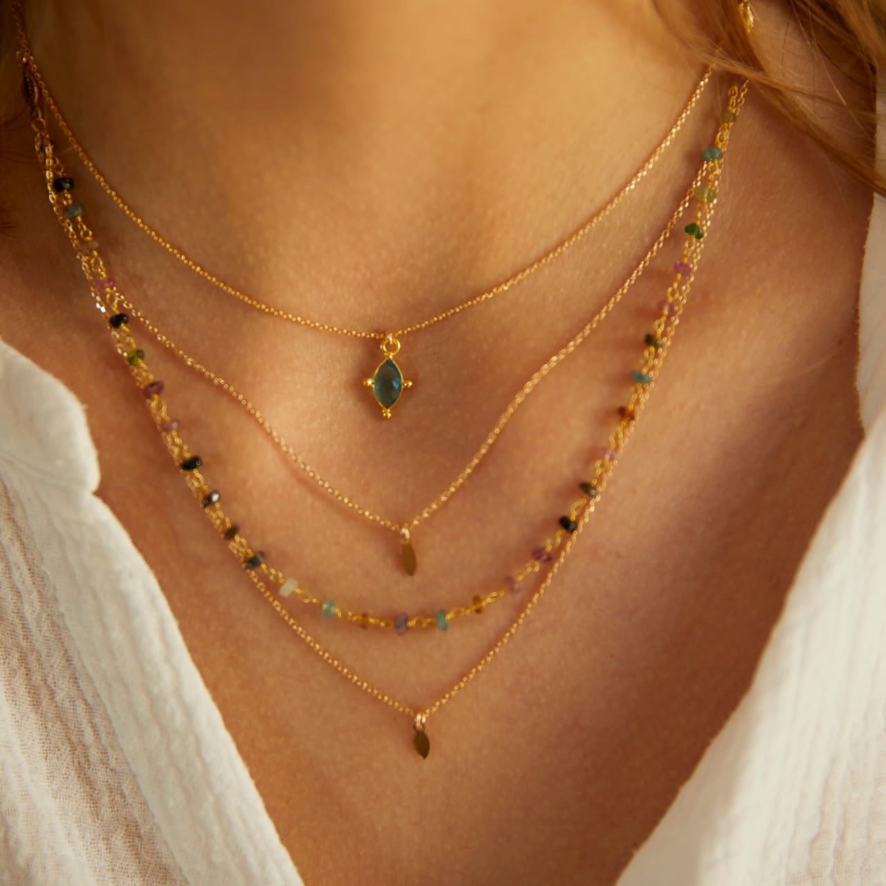 目を引くカラフルなストーンと、エレガントなゴールドチェーンのミックスデザインが特徴のマルチネックレス。華奢で繊細なデザインが女性らしさを際立たせ、ショートレングスでありながら存在感も十分。デイリーユースから特別なパーティーやライブシーンまで、幅広い場面で活躍すること間違いなしです。重ね付けもしやすく、お手持ちのジュエリーと組み合わせて、より華やかさをプラスすることができます。自分らしいスタイルにこのネックレスを取り入れて、コーディネートに遊び心と洗練をプラスしてみてください。